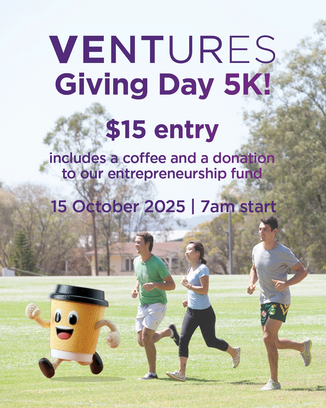 Whether you join us on the track at St Lucia, bring your pup for a morning stroll, or meet us for coffee afterwards, your participation will help fuel the next wave of UQ founders, dreamers, and changemakers.